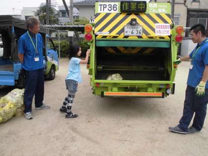 2t積みパッカー車の迫力に驚きながら,新聞紙入りのゴミ袋をパッカー車に投げ入れ,専用のボタンを押して詰め込み完了!
