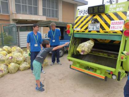 2時間目は,校庭でパッカー車詰め込み体験と,質問をさせていただきました。