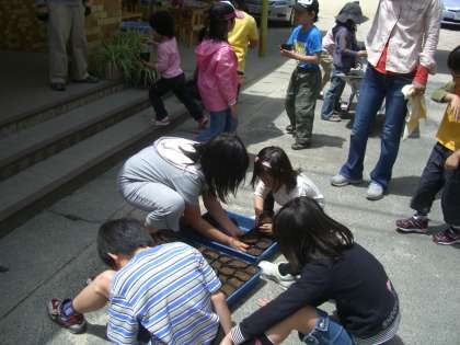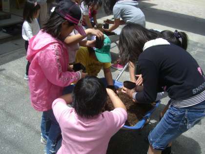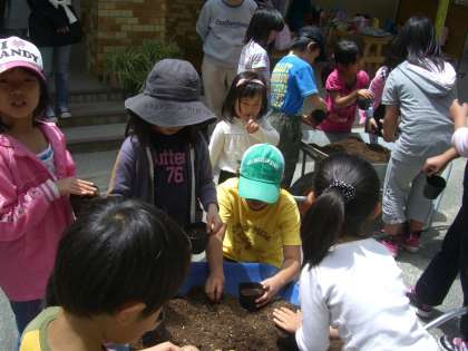 次は,「緑のカーテン」作りに向けての種蒔です。去年収穫しておいたヘチマやみかん,フーセンカズラ等の種を観察した後,ヘブンリーブルーやスカーレットオハラのアサガオとキュウリの種をまきました。今年も素敵な「緑のカーテン」ができることを願って,頑張りました。