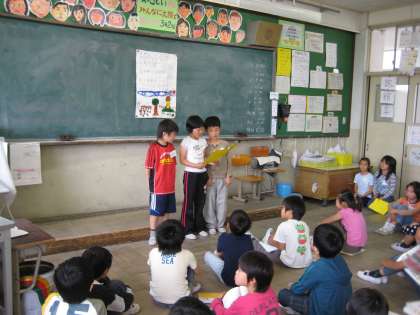今日は、国語で学習してきた「きつつきの商売」の音読発表会をしました。兄弟学年である5年生を招待していたので、子どもたちは朝から、どきどきわくわくしている様子でした。「きんちょうしていたけれど,大きな声で言えたから、うれしかったよ。」「5年生が最後まで聞いてくれて,うれしかった。」子どもたちの感想には、こんな喜びの言葉がたくさんあふれていました。また,5年生と交流できることが楽しみですね。