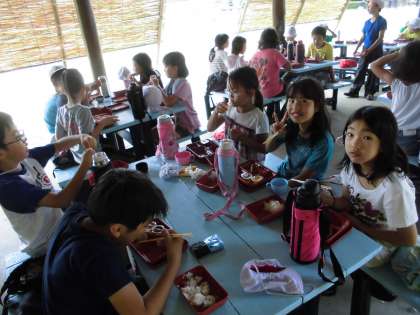 芝生広場で遊んだあとは,昼食です。みんなよく食べていました。