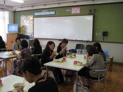 その後,子どもたちの給食時間の様子を参観していただきました。入学して2か月,給食当番もしっかりできるようになりました。給食も,もりもり食べられるようになりました。