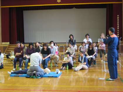 消防署の方から,応急手当の重要性についてお話を聞いた後,心肺蘇生法とAEDの使い方の講習を受けました。はじめは遠慮がちだった参加者もしだいに慣れ,迫真の演技を交えた実技を行うグループもありました。