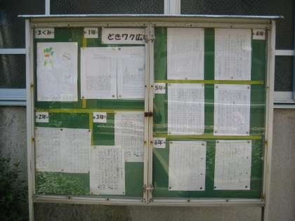 本校では,「書く力」をつける学習指導に全校で取り組んでいます。昼の学習タイムでは,どのクラスも週1回「作文タイム」を設け,身近なことに目を向け,五感を働かせて表現する力を育てています。また,玄関横の掲示板を『ドキワク広場』とし,各学年から数点ずつ作文を掲示し,書くことへの意欲につなげています。