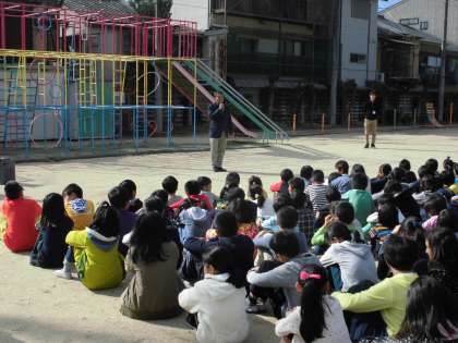 11月20日(金)の2時間目,全校で火災発生時における避難訓練を行いました。  「北校舎3階から出火した。」という想定で,全校が運動場南側へ避難をする訓練でした。