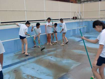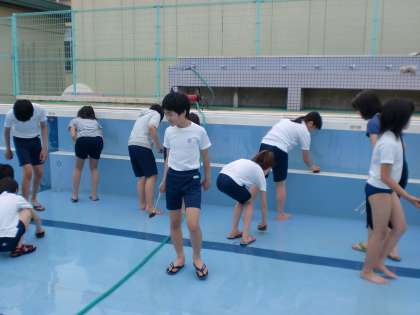6月7日(月)に5・6年でプール清掃をしました。水量の減ったプールの底には桜の葉っぱや泥などがたまり、プールサイドにはコケがところどころについていました。そこで、みんなでブラシとたわしを使って一生けん命磨きました。おかげで、40分後にはたいへんきれいになりました。