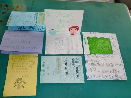 音読発表会に招いた5年生から,次はお茶会に招待してもらいました。火曜日の給食の時間に,5年生が全員教室へ来て,直接3年生のみんなに一言のメッセージとともに招待状を手渡ししてくれました。朝から,「今日は、5年生が招待状を持ってきてくれるよ。」と知らせていたので,ワクワクしながら待っている子どもたちでした。受け取った時は,さらに素敵な笑顔になって,どの子もうれしそうにしばらく眺めていました。