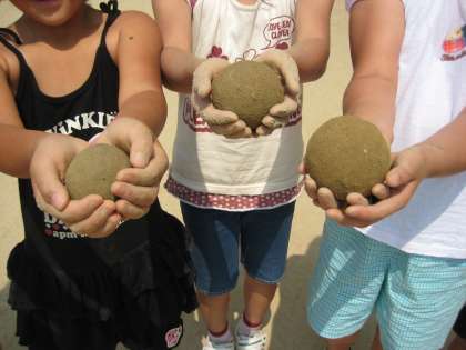 6月12日(土),土曜学習(学習活動)が終わってから,運動場で休憩をしていた子どもたちが,しゃがんでなにやら始めています。近寄ってみると,炎天下の中,泥だんごづくりです。みんなとっても上手で,見る間にまん丸ぴかぴかの泥だんごが出来上がりました。宝物のように手のひらにのっています。