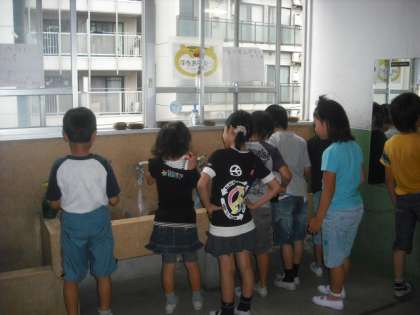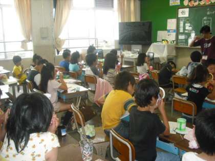 1・2年生と3くみは、歯科衛生士さんによる歯みがき巡回指導で、歯のみがき方やむし歯予防について教えていただきました。3年生以上は、各担任の先生に、歯みがき指導をしていただくことになっています。