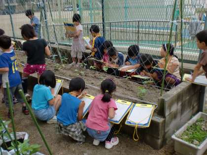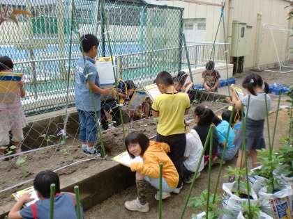 先日植えたサツマイモやキュウリの苗とミニトマトの成長の様子を観察しました。