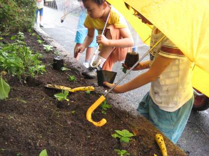 みんな傘をさしながら,ひまわりと日々草の苗を植えました。
