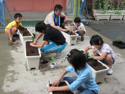 その後は,渡り廊下で活動です。かぼちゃ,スイカ,トマト,メロン,オクラの苗をプランターに植えました。実がなるのが楽しみです。