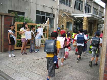 普段は,なかなか大きな声が出ない登校班が多いのですが,その声につられるように集団登校で登校してきた子どもたちの列からも大きなあいさつの声が返ってきます。