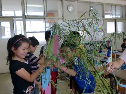 もうすぐ七夕ですね。七夕といえば、願い事です。今日校長先生が笹を切ってきてくださったので,さっそく七夕飾りを作り,短冊に願い事を書きました。短冊に願い事を書いて、みんなでつるしました。