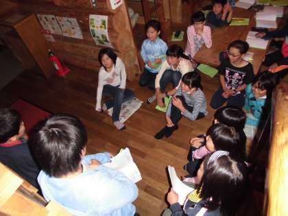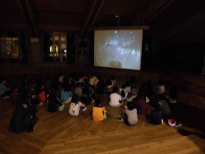 その後の天体観測は…曇り空のために中止になってしまいました。残念ですが,仕方ありません。花背山の家の先生が星空のDVDを用意してくださったので,みんなで鑑賞しました。