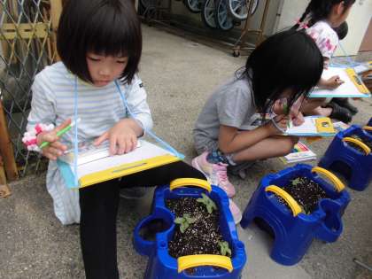 25日(水)の1時間目に芽の観察をして「はっぱがハートの形ににてる!」「はっぱにたくさん線があったよ!」といろいろなことに気が付いていました。