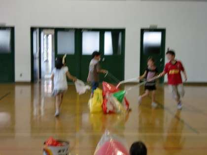 左の写真のように,班のみんなで協力してつくりました。そして,班の個性があふれ出た作品が出来上がりました。中央の写真は「虹色トンネル」,右の写真は「メリーゴーランド」と名づけられていました。二つの作品だけでなく,どの作品も工夫がいっぱいあり,とってもすてきにできました。