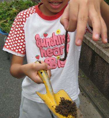 栽培活動が始まるまでのひとときも,子どもたちの楽しみにしている時間かもしれません。今日は,ひょうたん池のめだかを観たり,観察池の金魚にえさをやったり。生き物とふれあい,その命を感じること・・・それは『みどクラ』の活動目標そのものです。そういえば,今日一番盛り上がったこと,それは,実は「ミミズ」なんです。土の中から出るわ出るわ,あっちでもこっちでも,きゃーきゃー,ワーワー。最初は気持ち悪がって,移植ごてでつついていた子どもたちでしたが,
