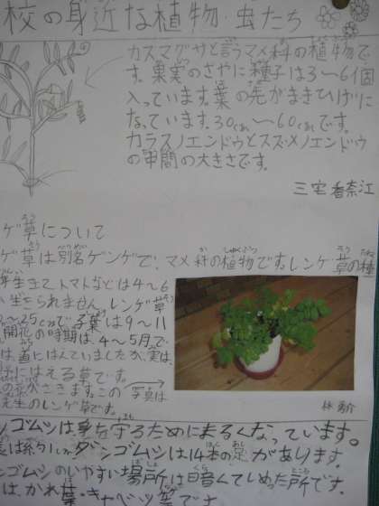 さて,どんな記事が掲載されているのでしょうか・・・池のコイ,飼育小屋のウサギ,校長室のレンゲソウ,校長先生が朝会で紹介されたカスマグサ,そしてダンゴムシ。身の回りの環境から見つけたり,興味をもったりしたことを,それぞれの視点から取材し,記事にしています。