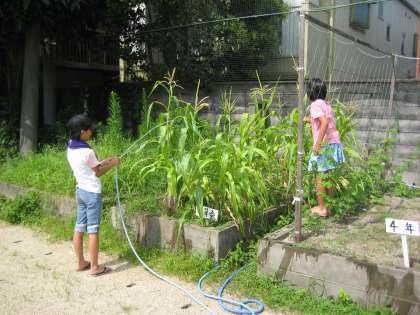 ウサギの世話も草花の水遣りも大変だけど,とても大切な仕事です。当番の子どもたちが学校の生き物たちの命を守っているのだと,こんなに暑い日は余計に感じます。そして,余計にうれしくなります。