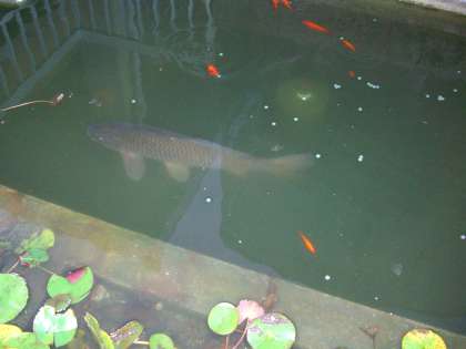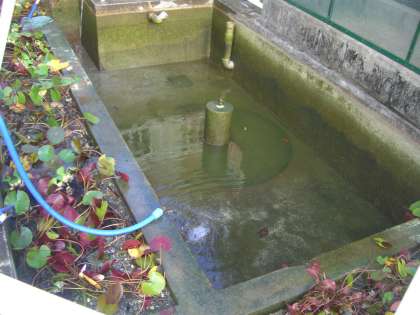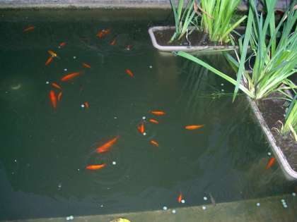 1年間の汚れや繁殖した藻で水が汚れ,金魚の姿が見えなくなっていました。60センチ以上ある鯉やたくさんの金魚で水をくみ出すのは大変でしたが,きれいになった水の中を気持ち良さそうに泳ぐ姿を見ると,気持ちもスッキリです!