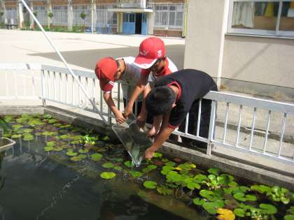 8月5日(木),大きく育った金魚を,昨日きれいになった観察池に放しました。
