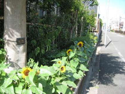 グリーンベルトのひまわりは今が盛り,元気いっぱい競うように咲いています。蕾もたくさんついているので,これからしばらくは次々と咲いて,道行く人たちに夏らしさを感じてもらえることと思います。