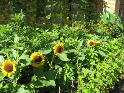 玄関前のひまわりも咲きそろいました。こちらはとても行儀よく並んでいます。