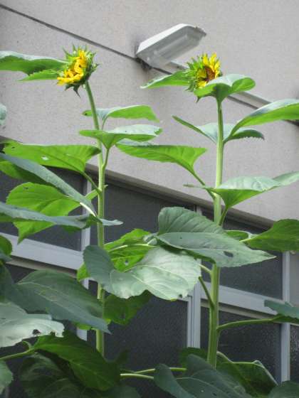 そんな朝,ついに,待ち焦がれていた花が咲きました。正門を入ってすぐ左の,一番大きなひまわりです。