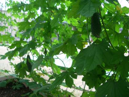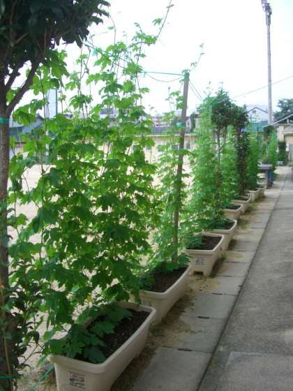 本校のもう一つの緑のカーテン「ゴーヤのトンネル」が,ぐんぐん成長し,屋根になるところまできました。実も,いくつかぶら下がりはじめました。子どもたちが登校してきたら,その成長ぶりに驚くことでしょう