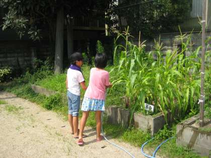 毎日暑い日が続きます。植物にとってなくてはならない水。その水やりは,大切な仕事ですが,暑くて大変です。その暑い中で朝から,環境緑化委員会の子どもたちが学級園の水やりをしてくれています。子どもたちだけでは大変なので,玄関前は管理用務員さんがやってくださっています。そして夕方は,教職員で当番を決めて水やりをしています。