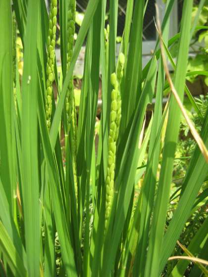 8月14日にイネの穂が出たことをお知らせしました。そして,遅れること1週間,もち米(滋賀羽二重)のイネにも穂が出ました。透き通るようなうす緑だったうるち米(滋賀旭)のイネの穂に比べると,色はしっかりしています。大きさも少し大きく,それにびっしりとついている感じがします。空に向かってまっすぐに伸びている穂が,これから,どんなふうに実を実らせ,頭を垂れていくのか,見守っていきたいと思います