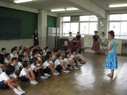 毎年,敬老会には,学校の子どもたちを代表して,4年生が出演しています。今年は,お祝いメッセージのほかにフラダンスを披露します。そのフラダンスを,女性会の方に教えていただくことになりました。