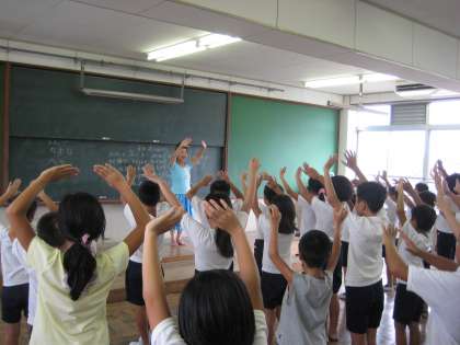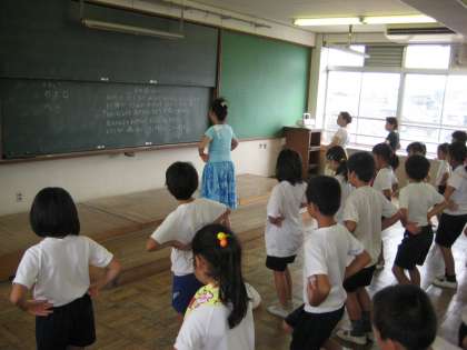 今日はその1回目です。どんな踊りかなあ・・・ドキドキしながら,朱七ホールに集まりました。まずはじめにステップを習ったら,次は手の動きです。「月の夜は〜浜に出て〜」手で丸を作って月を表したり,波のように動かして浜を表したり。先生の教え方もとても分かりやすくて,子どもたちはどんどん覚えていきます。1回目というのに,最後まで何とか踊ることができました。