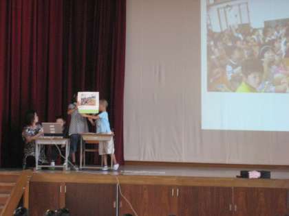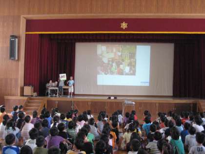 ちりりりりん,かわいいベルが鳴ると,後ろの大きなスクリーンに写真が映し出され,説明をする,という流れで,次々と活動の様子が紹介されました。3くみの3人の子どもたちは練習の成果を堂々と舞台の上で発揮していました。聞いている子どもたちも,そんな姿に応えるかのように,熱心に聞いていました。