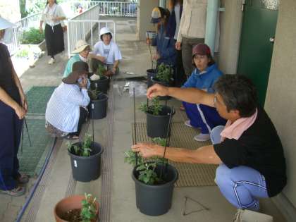 春から,全教職員で取り組んできた菊づくり。前回は,誘引具を使って3本立てになるよう茎を曲げました。誘引具で無理に下を向けられた茎が,ぐいと頭を持ち上げて上に伸びていこうとする姿は,何か心惹かれるものがありました。