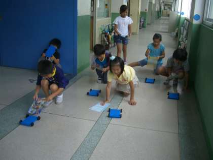 3階の廊下から,何やら楽しそうな声が聞こえてきます。レースの真っ最中です。真っ平らの車に一生懸命下敷きで風を送り,走らせようとしているのです。なかなか難しそうです。風の力と車の進む様子についての学習の始まりです。