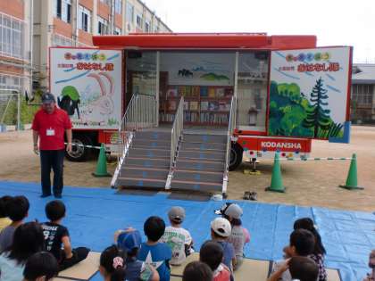 日本全国を訪問しているおはなし隊のキャラバンカーが、今日朱七小学校にやってきました。