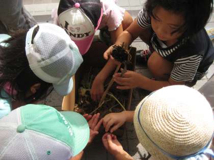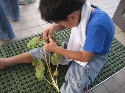 今日の栽培活動は,まず,咲き終わったヒマワリを抜き,そのあとにコリウスを植えることでした。けれど,コリウスを植えるのもそっちのけで,子どもたちが熱中し始めたことは・・・ヒマワリの種とりです。校長先生が声をかけても,なかなか次の活動に移れません。子どもたちを夢中にさせた種とりの魅力は,どこにあったのでしょうか。