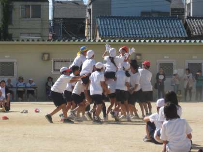 今年の運動会では,学年で取り組む2つの団体競技がありました。一つは,低学年の玉いれ,もう一つは6年生の騎馬戦です。