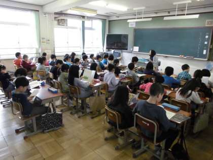 よい姿勢ですわって学習できる姿は,さすが2年生!そして,3年生は,ひとクラスになり,教室いっぱいに机を並べての学習がスタート!