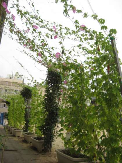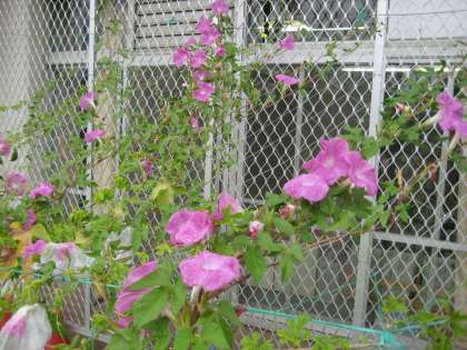 ゴーヤの緑とアサガオのピンク。ここにも素敵な「緑のカーテン」が出来ています。