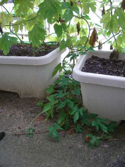このアサガオは植えたのではなく,プランターの間の地面から生えています。どうも去年の一年生が育てていたアサガオの種が落ち,自然に生えてきたようです。