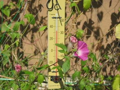 10月1日(金),今日から10月です。昨日の最高気温は19度だったそうですが,今日は打って変わってまるで夏に逆戻りしたように暑い日になりました。緑のカーテンにつるした温度計は30度を超えています。アサガオも夏が続いていると思っているかのように,花を咲かせています。