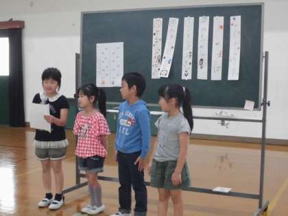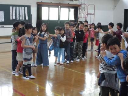「1年生が楽んでもらうために!」1年生と2年生でわくわくおたのしみかいを開きました。すべて2年生が企画をしました。まずは,じゃんけん列車。そのあとは,わくわくグループに分かれて,グループ遊びをしました。1年生が喜んでくれて,とっても嬉しい2年生でした。次は,学校たんけんに案内する予定です。