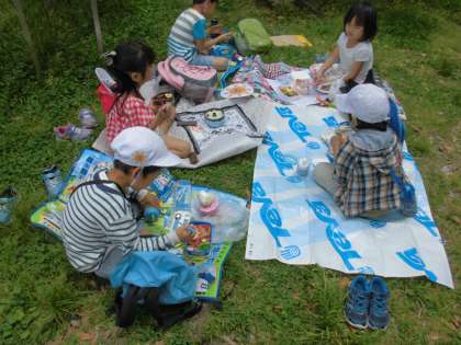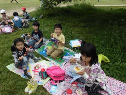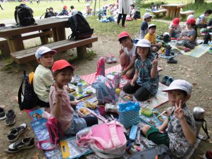 お昼は一緒に回ったわくわくグループで1・2年生なかよく食べました。