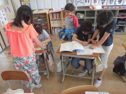 分度器を使った学習をしています。前時までは「角度をはかる」学習でしたが,今日は「分度器を使って角をかく」学習でした。ノートに線を引き,分度器で角度をはかりながら線を引きます。初めての経験で,なかなかうまくいかない子もいましたが,お互いに教え合う姿がほほえましかったです。繰り返し練習して,分度器の扱いに慣れ,正確に角がかけるようになりましょう。
