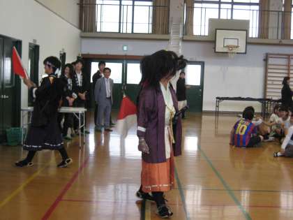 時代祭の説明が終わる頃,後ろから笛や太鼓の音が聞こえてきました。行進の始まりです。先頭は,なんと輜重頭の衣装を身にまとった校長先生です。子どもたちは,これにはびっくり。