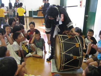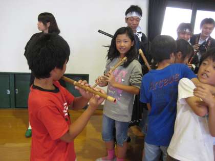 いよいよ,体験の始まりです。衣装を着たり,笛を吹いたり,太鼓をたたいたり,鉄砲をかついだり・・・どのコーナーも興味津々!実際に触れてみると,やっぱり見ているだけとは違います。やってみたくてたまらなくなります。交代の銅鑼が鳴っても,なかなか次に移動できませんでした。