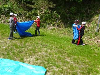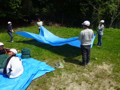 シュラフを片付けた後、シュラフを干した時に使っていたブルーシートを、声をかけたら多くの人が片付けてくれました。